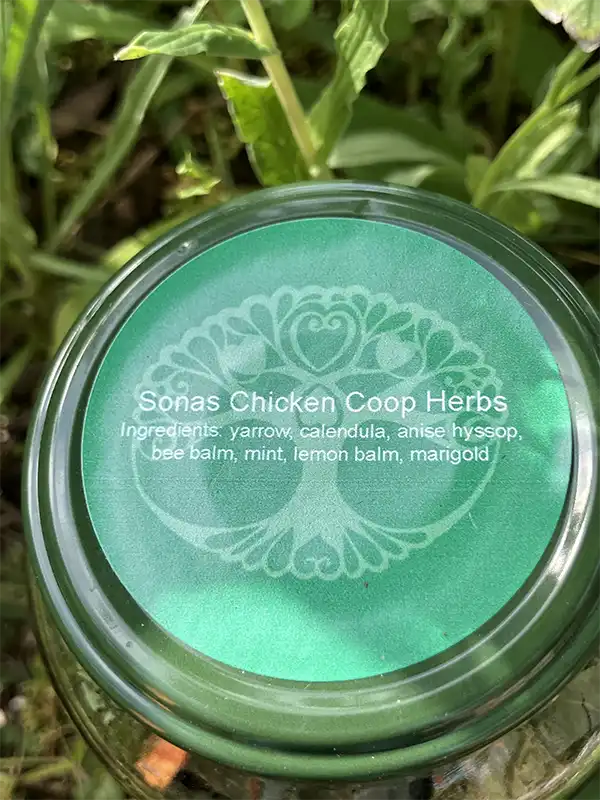 Herbs that are organically grown on my land, harvested and dried by me and used in my own coops. Our flock loves yarrow, calendula, anise hyssop, bee balm,mint, lemon balm and marigold….but the bugs do not! This is a lovely smelling bug repellent* and the herbs are all edible and supportive of the chickens health.