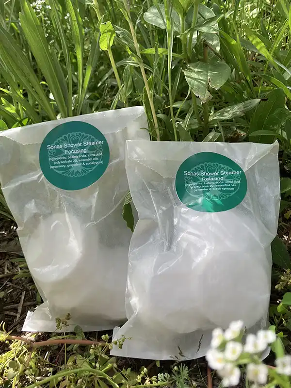For those who do not enjoy a bath these shower soothers give you some of the same benefits as the Sonas bath balms. Available in Focusing (baking soda, citric acid, polysorbate 20, rosemary, grapefruit & eucalyptus essential oils) or Relaxing (baking soda, citric acid, polysorbate 20, lavender & black spruce essential oils). Also available in custom aromas to support coughs and other needs. Please inquire. You simply drop one of the shower soother discs on the tub floor opposite the faucet and start the shower, inhaling deeply as the soother releases its aroma.